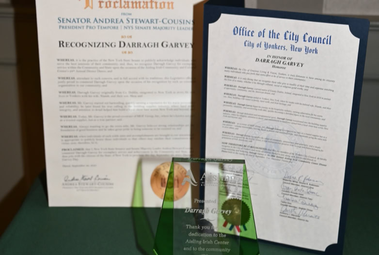 The 28th Annual Aisling Center Dinner Dance was held Friday, September 26th, honoring Darragh Garvey, partner of The MGF Group, Patrick K. Murphy, founder of New Logical Sports, and Derek and Becky Woods, founders of The Riverdale Children's Theatre. “Thank you all for joining the Aisling Center Dinner Dance as we celebrated our worthy honorees, Darragh Garvey, Patrick K. Murphy, and Derek & Becky Woods.” remarked Aisling Center Executive Director Sandra Feeney-Charles “ Our hearts are still full with all the warmth, excitement, and support received. We are deeply grateful for your unwavering support of the Aisling Center and the community we proudly serve. It was both an honor and a joy to celebrate your remarkable achievements and selfless contributions, and because of you, our neighborhood is a better, brighter place.” Many members of the RCT family , past and present, joined with staff members for the event. “This honor is shared by Becky and I with all of the tremendous kids, families and artists that bring the RCT mission to life” remarked Mr. Woods ”The Aisling Center is a vital hub of our Woodlawn community, and a beacon to the entire Irish - American Community. To be recognized by them for our work is truly extra special”